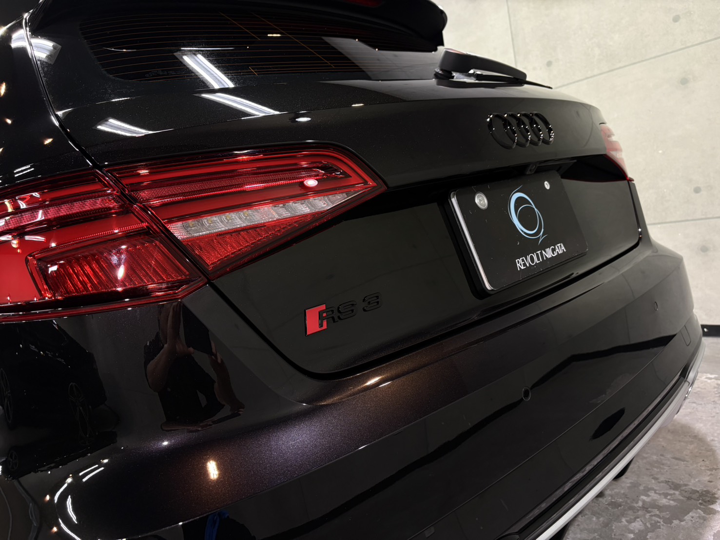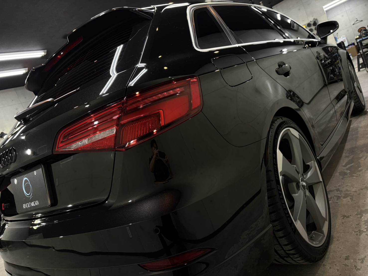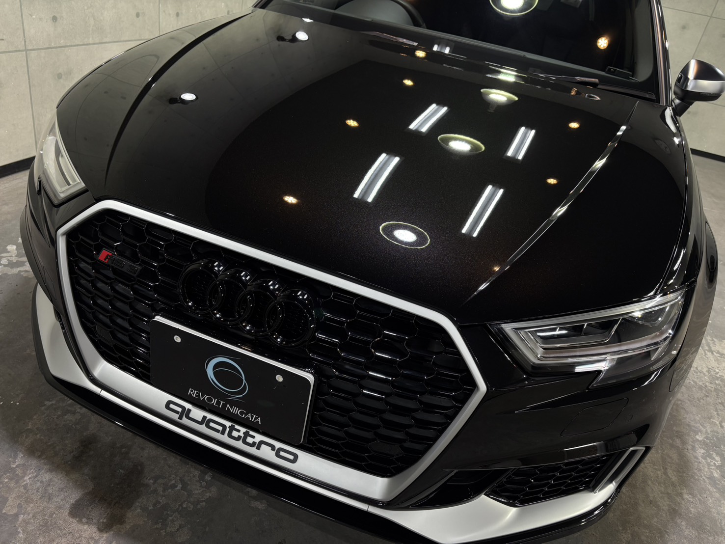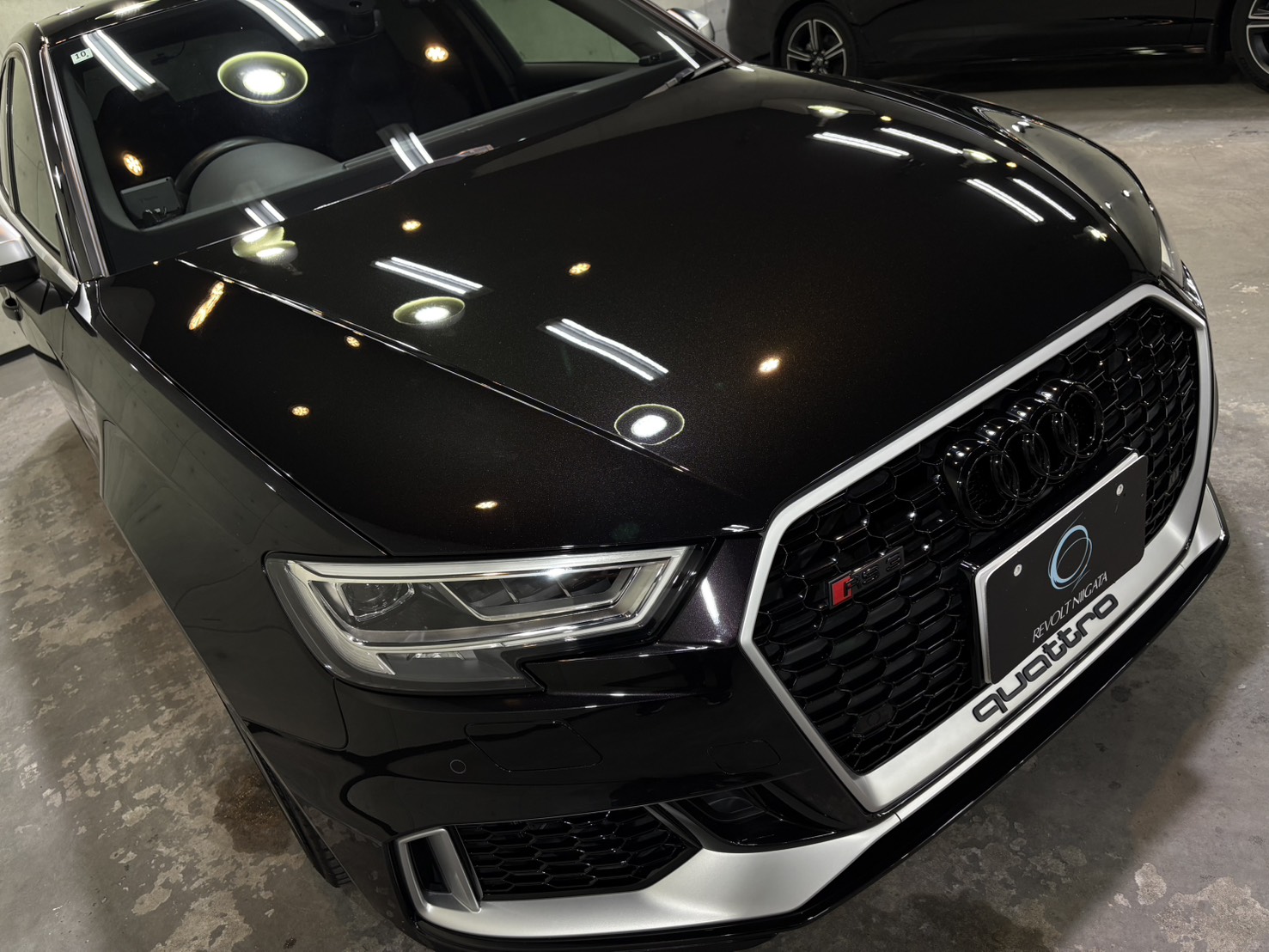 施工後は、ボディ全体に均一な艶が広がり、RS3のシャープなボディラインがより一層際立つ仕上がりとなり、光の映り込みも非常にクリア。