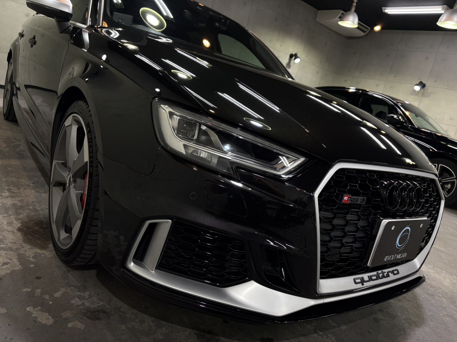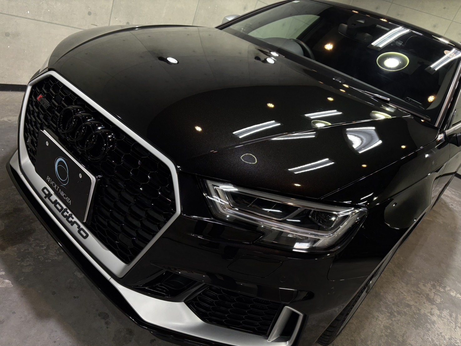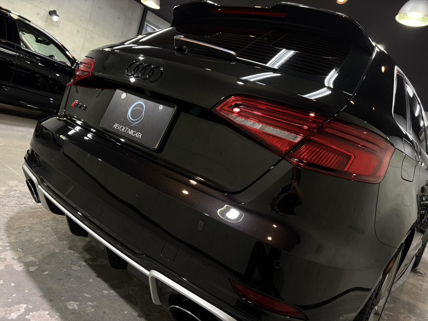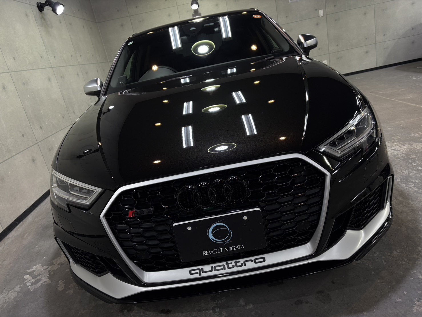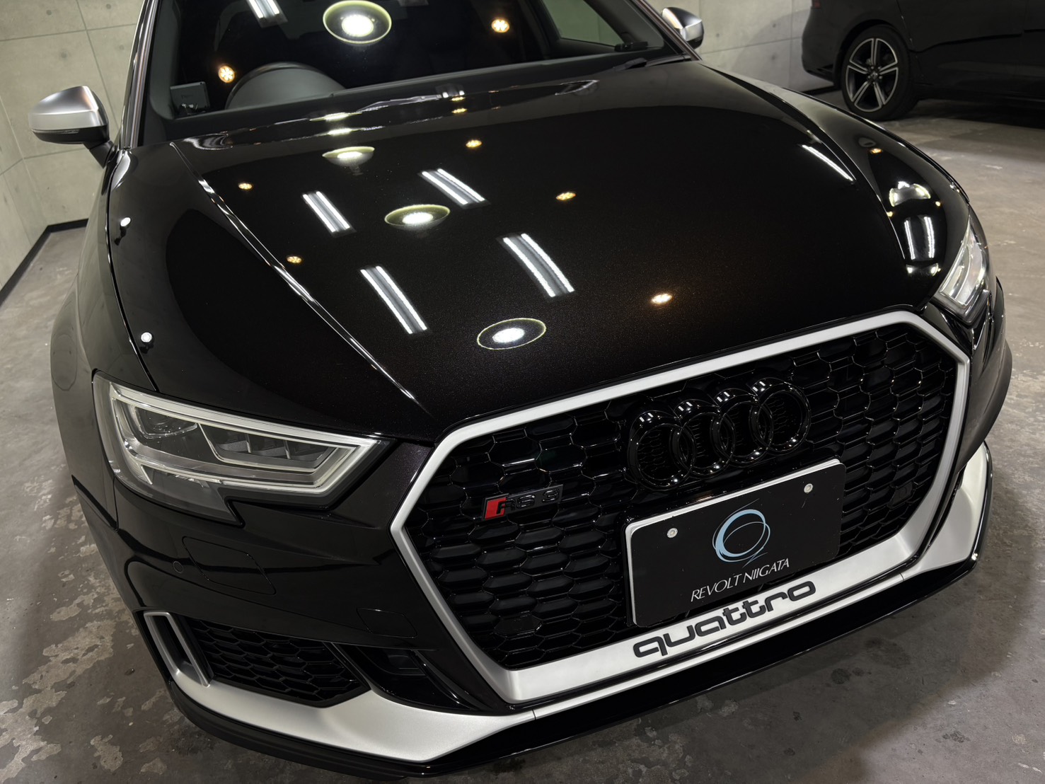 施工後は、ボディ全体に均一な艶が広がり、RS3のシャープなボディラインがより一層際立つ仕上がりとなり、光の映り込みも非常にクリア。