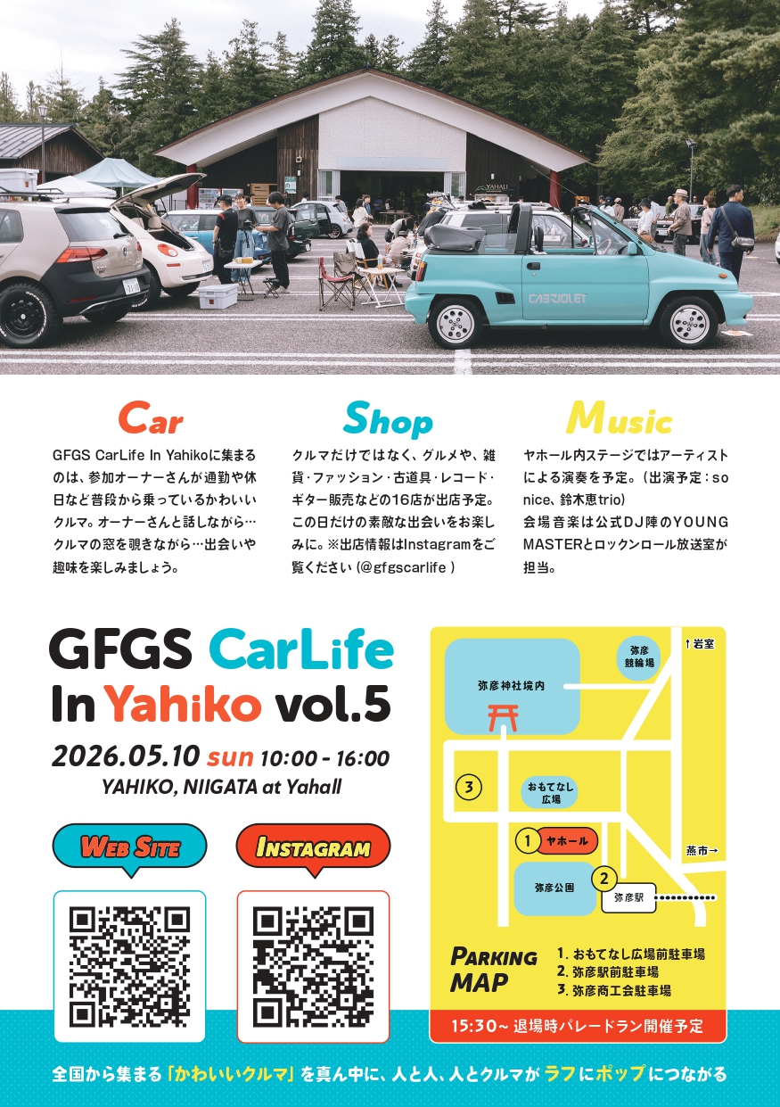 新潟県の有数の観光地の一つ「弥彦村」を舞台に、新潟県弥彦村で「かわいい車」をテーマにしたカーイベント『GFGS CarLife In Yahiko』が開催されます。